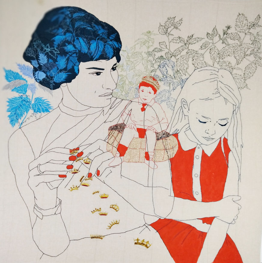 Je collecte des tissus, des textures, des fils de couleurs, je fouille les souvenirs, j’invente des histoires, je récolte et superpose des images, je brode et je peins. Entre contes et comptines, c’est un vagabondage au parfum de nostalgie et d’élucubrations narratives. Un sens vient progressivement s’imposer à travers l’organisation des différentes superpositions. Le temps d’une histoire.